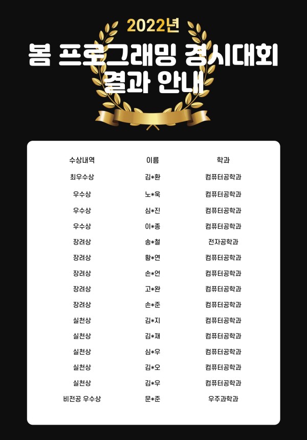 2022 봄 프로그래밍 경시대회 결과 안내 페이지 정보 작성자 SW중심대학 댓글 0건 조회 1,372회 작성일 22-05-24 14:04 본문 [최우수상] 상장 및 상금 100만원[우수상] 상장 및 상금 50만원[장려상] 상장 및 상금 30만원[비전공 우수상] 상장 및 상금 30만원[실천상] 상장 및 상금 10만원* 수상자는 05월30일부터 SW중심대학사업단에 방문하여 상장을 수령 바라며 상금 지급에 필요한 서류(이메일 안내)를 05월 27일(금)까지 사업단 이메일(swc@khu.ac.kr) 및 사업단 사무실로 제출바랍니다. 목록 이전글2022 봄 프로그래밍 경시대회 22.05.30 다음글2022 K-SW스퀘어 가을 프로그램 최종 선발 안내 22.05.19 댓글목록 댓글목록 등록된 댓글이 없습니다.