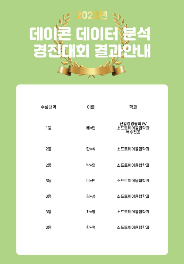 2022 데이콘 데이터 분석 경진대회 결과 안내 페이지 정보 작성자 SW중심대학 댓글 0건 조회 1,122회 작성일 22-06-02 14:49 본문 상금 지급에 필요한 서류(이메일 안내)를 사업단 이메일(swc@khu.ac.kr) 및 사업단 사무실로 제출바랍니다. 목록 이전글2022 데이콘 데이터 분석 경진대회 22.06.02 다음글2022 봄 프로그래밍 경시대회 22.05.30 댓글목록 댓글목록 등록된 댓글이 없습니다.