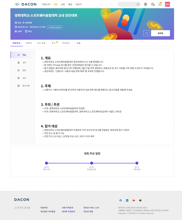 2022 데이콘 데이터 분석 경진대회 페이지 정보 작성자 SW중심대학 댓글 0건 조회 1,161회 작성일 22-06-02 14:53 본문 [대회 화면 캡쳐본]온라인으로 진행된 이번 대회는 전공자(컴퓨터공학과 및 SW융합학과, 복수전공 포함) 45명, 비전공자 5명이 신청하였으며, 교내에서 처음 진행되는 AI 빅데이터 분석 경진대회였음에도 많은 학생이 참가하여 높은 관심을 보였습니다. 목록 이전글경희대학교 SW중심대학 포트폴리오 사이트 오픈 안내 22.06.16 다음글2022 데이콘 데이터 분석 경진대회 결과 안내 22.06.02 댓글목록 댓글목록 등록된 댓글이 없습니다.
