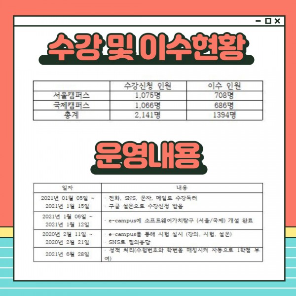 2021년 SW예비대학 운영결과 안내 페이지 정보 작성자 SW중심대학 댓글 0건 조회 1,508회 작성일 21-07-14 10:36 본문 목록 이전글Start Up the Dream_프로토 타입 빌딩 21.08.30 다음글SW가치확산(2021년 1학기) 21.07.07 댓글목록 댓글목록 등록된 댓글이 없습니다.