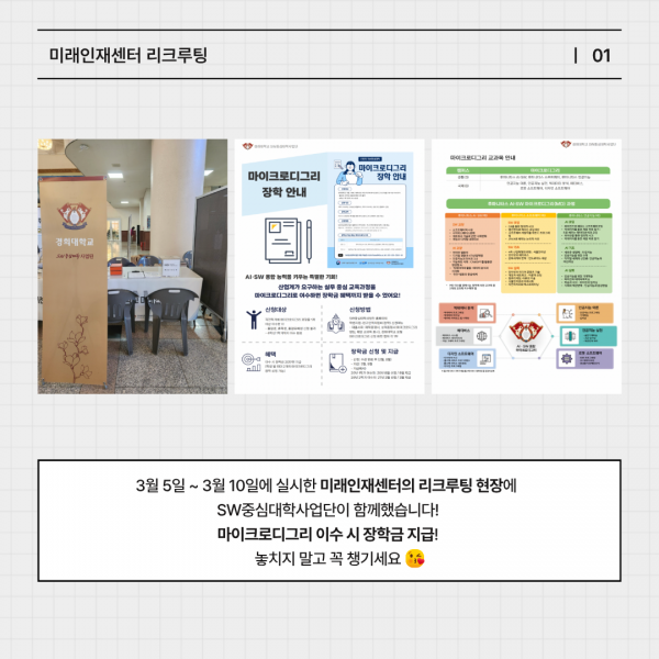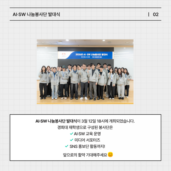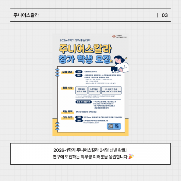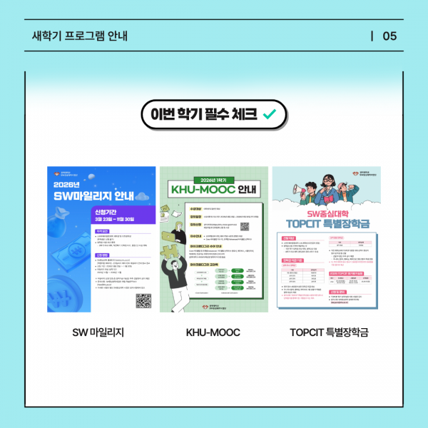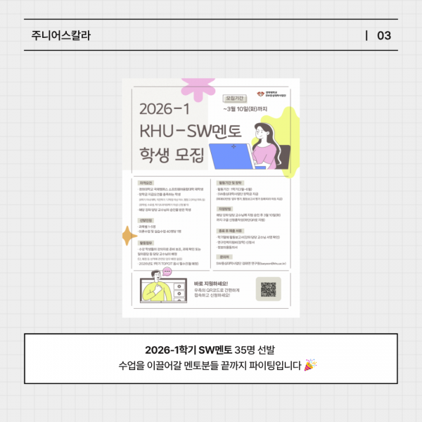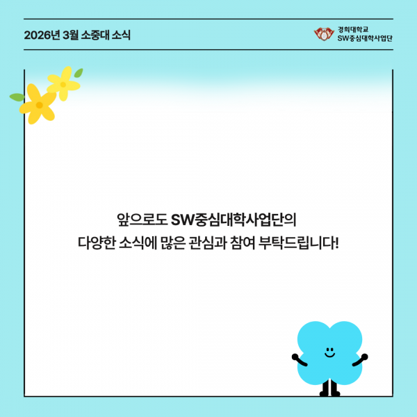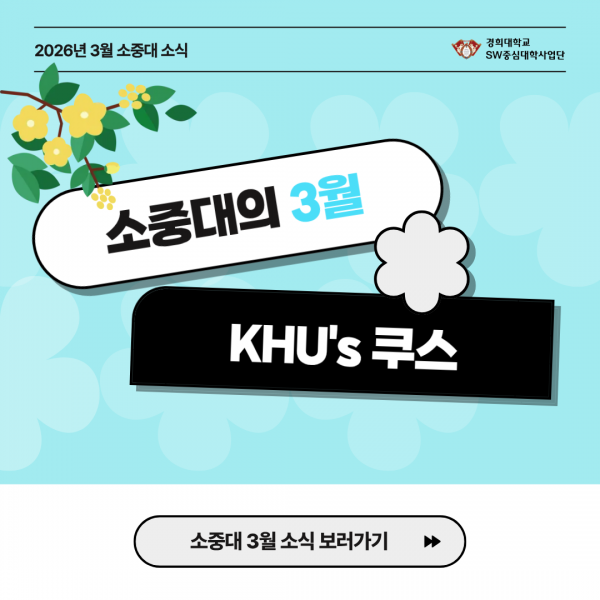 [KHU's 쿠스] 2026년 1월 SW중심대학사업단 뉴스 페이지 정보 작성자 SW중심대학 댓글 0건 조회 1회 작성일 26-03-26 16:18 본문 목록 다음글2026-1학기 주니어스칼라 선정 안내 26.03.17 댓글목록 댓글목록 등록된 댓글이 없습니다.